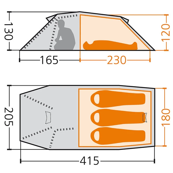 Die Apsis bietet mit 165 x 205 cm viel Platz für Rucksäcke, Packtaschen und diverse andere Ausrüstung. Sie kann über den Seiten- oder Fronteingang betreten werden. Bei milder Witterung kannst du über Nacht den Fronteingang geöffnet lassen und so für maximale Belüftung sorgen.