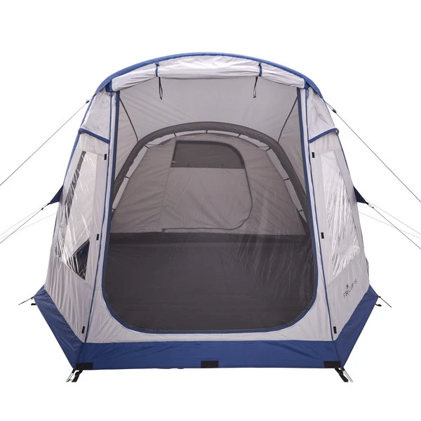 Das Innenzelt bietet Platz für 3-4 Personen. Vier Innentaschen ermöglichen jedem ein paar Kleinigkeiten zu verstauen. Zusätzlicher Platz ist in der Apsis vorhanden. Diese ist ca. 180 cm hoch, bietet zwei Eckfenster, genügend Platz für einen Tisch mit Stühlen und eine Stromkabeldurchführung in die Apsis und ins Innenzelt. Zum Schutz vor Schmutz ist eine feste Bodenwanne im gesamten Zelt eingenäht, die auch das Aufsteigen kondensierender Bodenfeuchtigkeit verhindert.