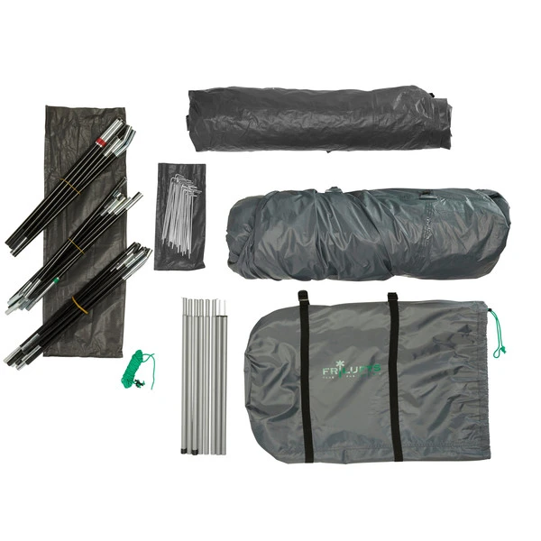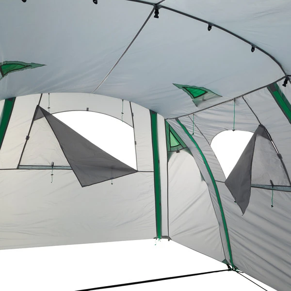 In der Apsis ist Platz für Ausrüstung oder einen kleinen Tisch mit Stühlen. Bei schönem Wetter lassen sich alle drei Eingänge aufrollen oder mit den im Lieferumfang enthaltenen Aufstellstangen aufstellen. Das Aufstellen sorgt nicht nur für besseres Klima und schönen Ausblick, sondern dient gleichzeitig als Sonnenschutz. Jede Tür verfügt über ein eigenes Fenster, das mit Stoff verschlossen werden kann.