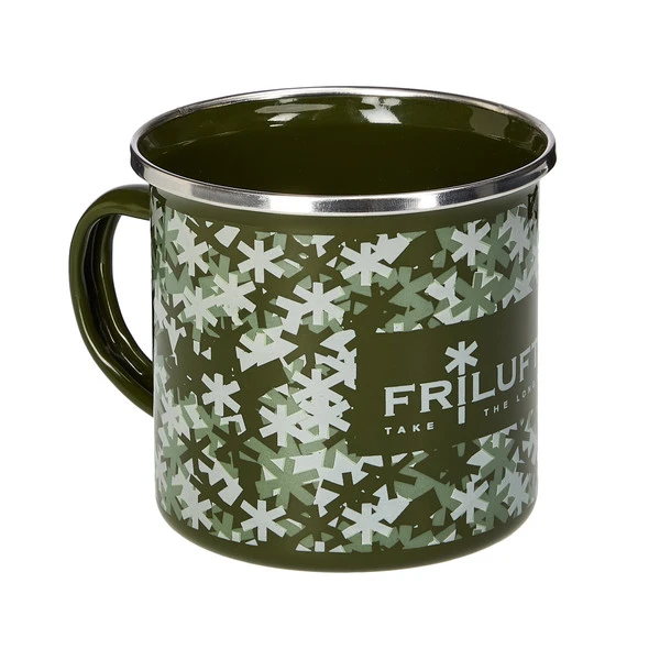Lackierter Emaille-Becher mit Frilufts Print und Edelstahlrand. Gut geeignet für den morgendlichen Kaffee am Lagerfeuer. Der Becher fasst 350 ml und misst 8 x 9 cm (HxB).